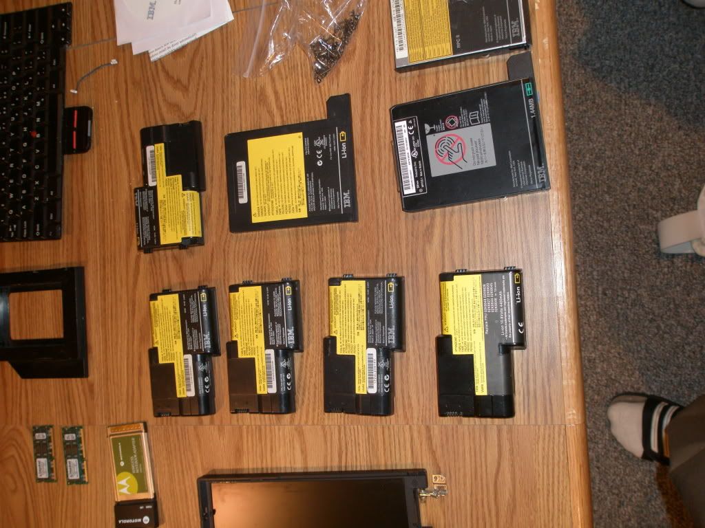 First thing is a lot of 6 IBM T2x series batteries (5 System and 1 Ultrabay). At least 4 of the 6 work well. The one or two bad of the 6 get about an hour or two only out of them. I know the ultrabay one works great. These have been sitting for probably the last year or so in a climate controlled room. I would like to get $60 shipped for the lot.