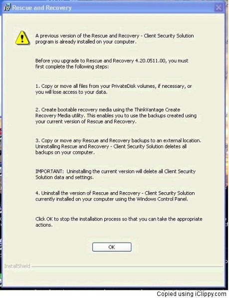 Any advice on how to get around this? I'm running Windows XP Pro on a Thinkpad R40. Rescue and Recovery is v3.01.0042; I tried to download and install the latest RnR update (v4.2) from the Lenovo site but it won't install - it gives the following message about my needing to delete the existing RnR installation first, which "Add and Remove Programs" in the WinXP Control Panel won't do - it returns a bunch of garbage-messages about "Unable to install ..." when I'm not wanting to install - I'm trying to DELETE: