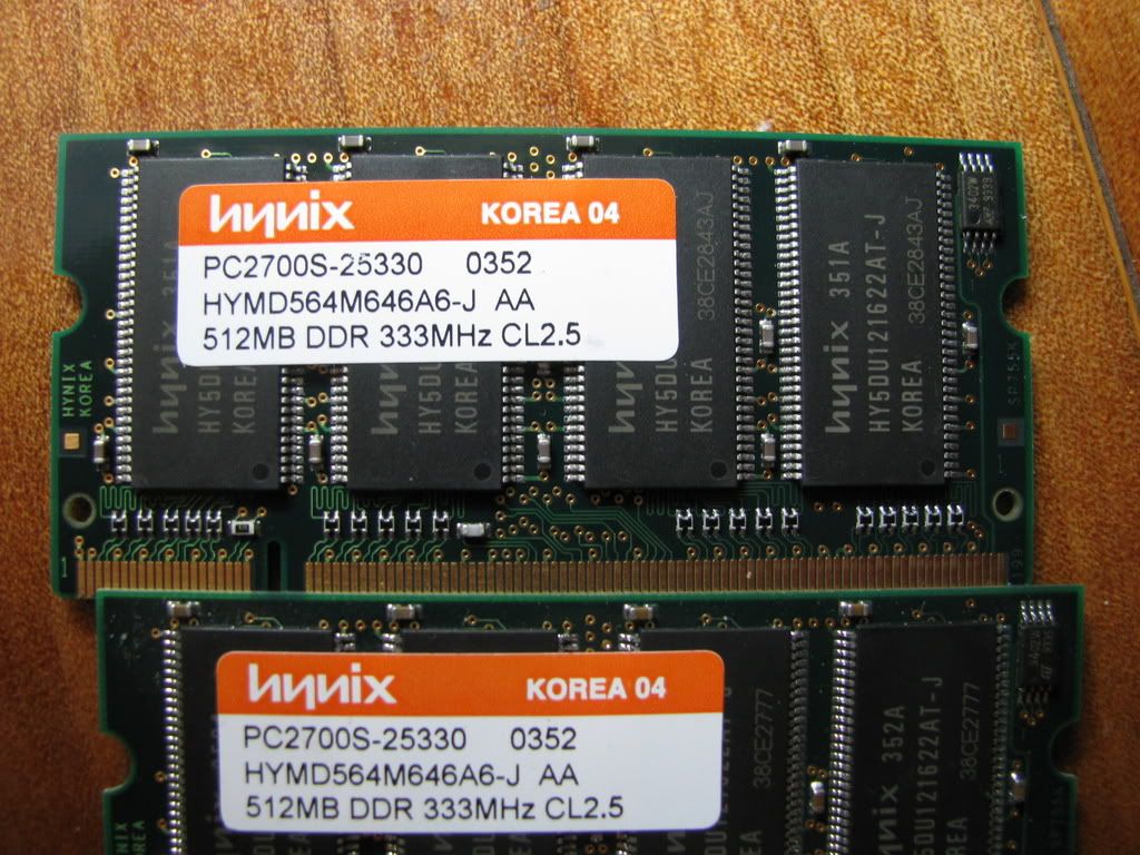 DIMM1: Hynix HYMD564M646A6-J 512 MB PC2700 DDR SDRAM (2.5-3-3-7 @ 166 MHz) (2.0-3-3-6 @ 133 MHz)