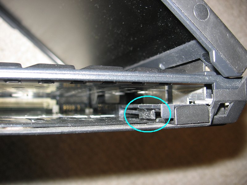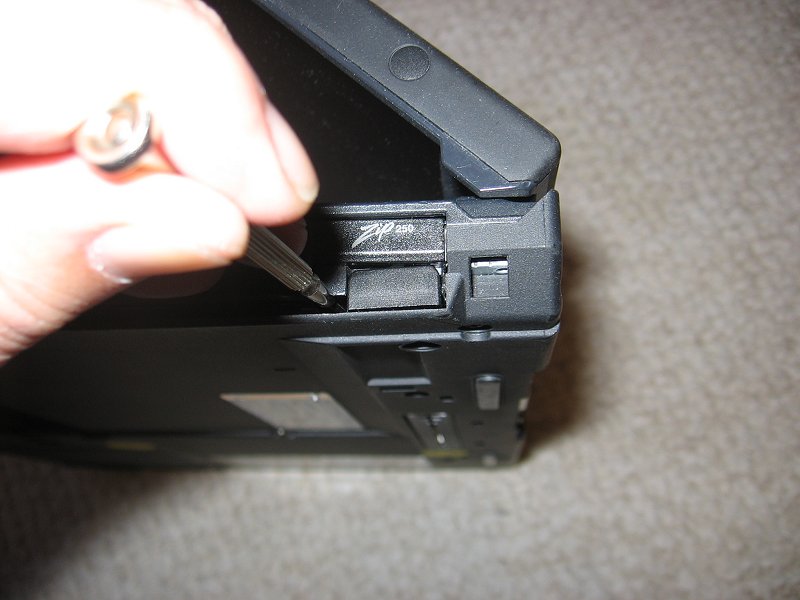 i have two t23's but one is broken, the broken one has a dvd rom drive and my working one has a floppy drive (useless to me). i wanted to change the floppy to the dvd drive and i cant becuase the little switch that ejects the drive out of the ultrabay doesnt do anything. i tried poking around with a paperclip and it wont budge. any suggestions? i would rather not destroy the laptop itself i just want the drive out