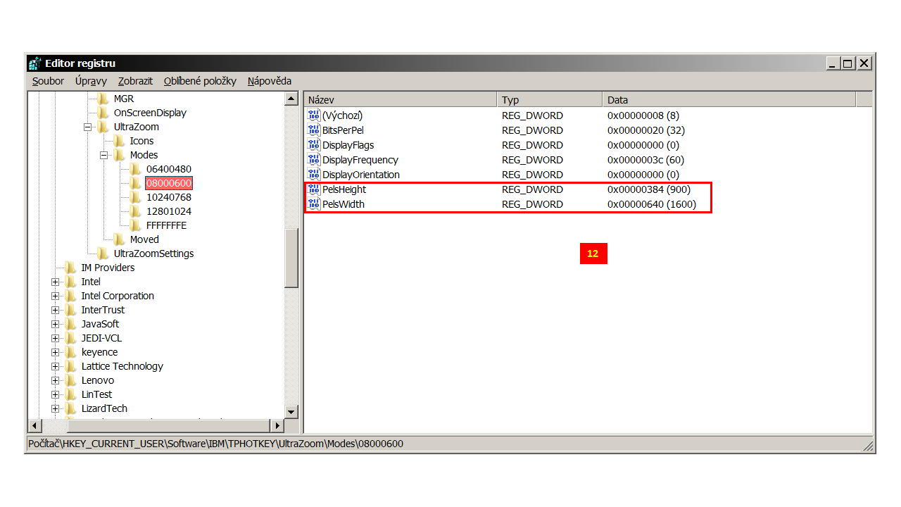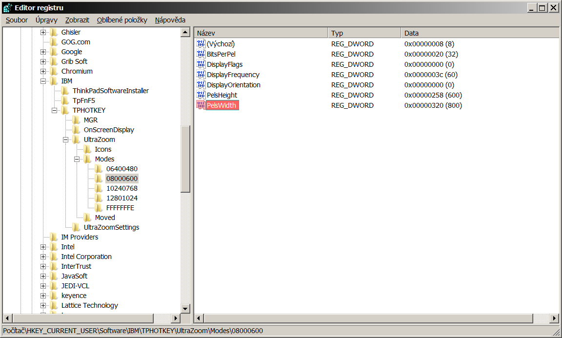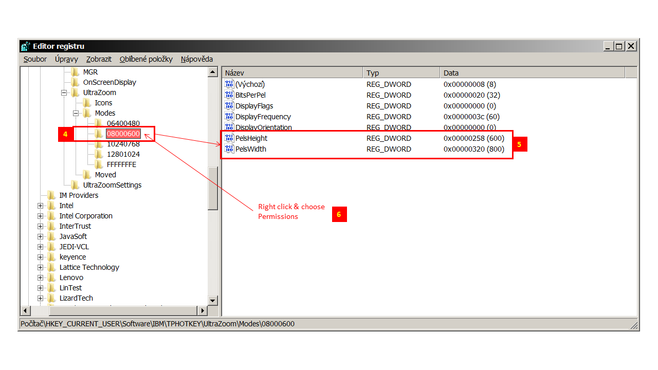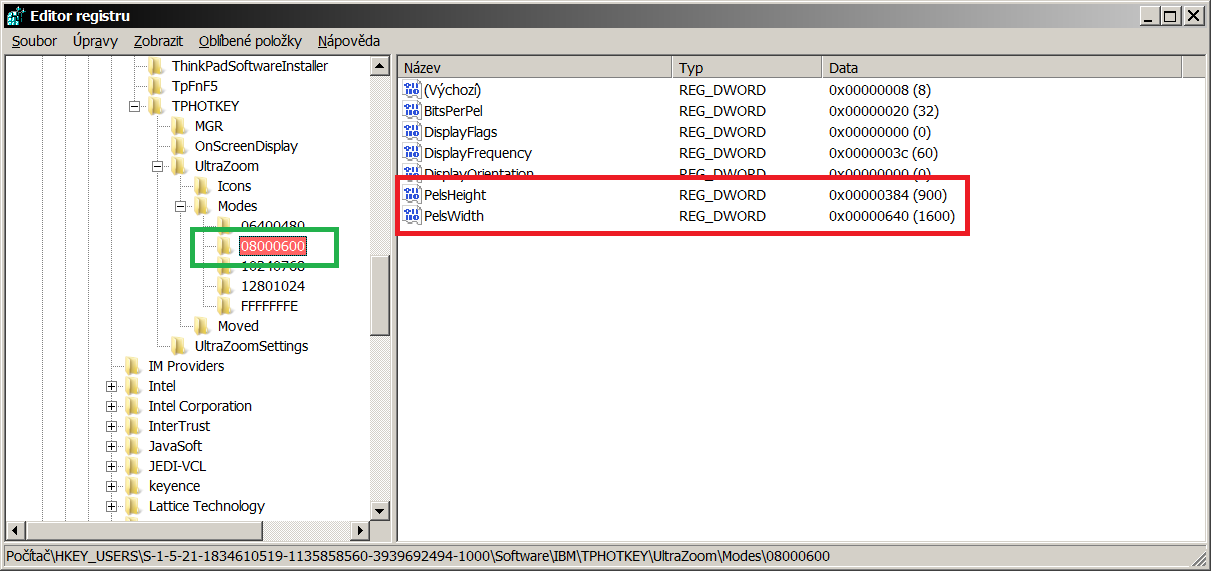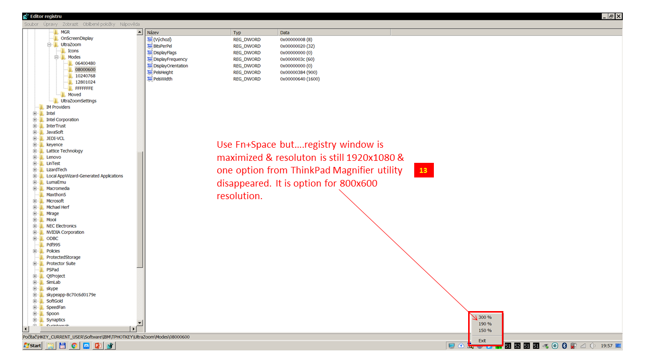I followed this topic to modify my Hotkey Features Integration and its ThinkPad FullScreen Magnifier utility but unfortunately no success. I think I have found correct key in register but I can not find exactly what is written above. My mode do not contain 000000EA. I followed path you described here but content is a bit different. May be because I have Win7 & last update of Hotkey Features Integration. My ThinkPad is W510 type and I have 1920x1080 as a default resolution & when I am using ThinkPad FullScreen Magnifier utility I have the 800x600 resolution (default). How can I modify registers & permisions? I already tried what I know but I need more experienced person to help me modify resolution from 800x600 to 1600x900 in ThinkPad FullScreen Magnifier utility and its registers.