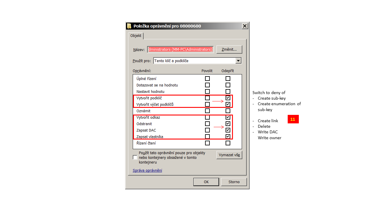create subkey, enumerate subkeys, create link, delete, write DAC, write owner.