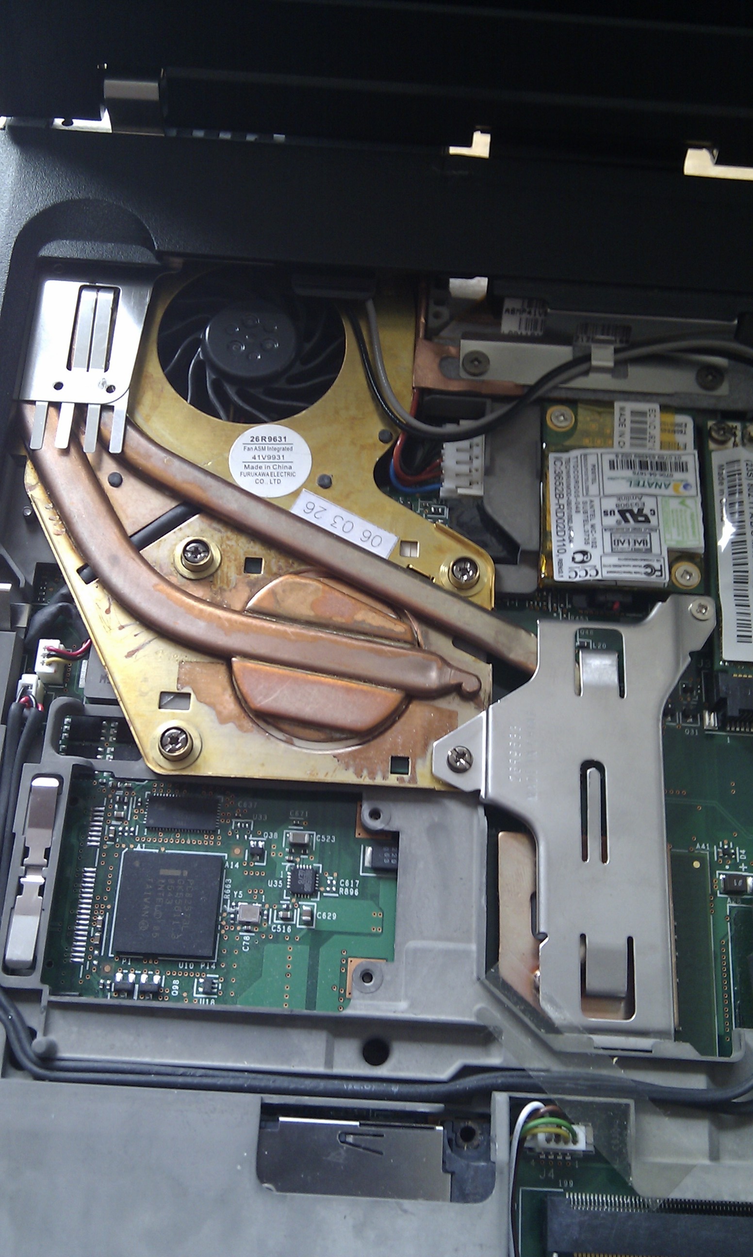 Received an 41V9932, wiped the cooler + CPU clean, and put on some fresh silver cool paste. Popped in the fan, assembled the laptop.