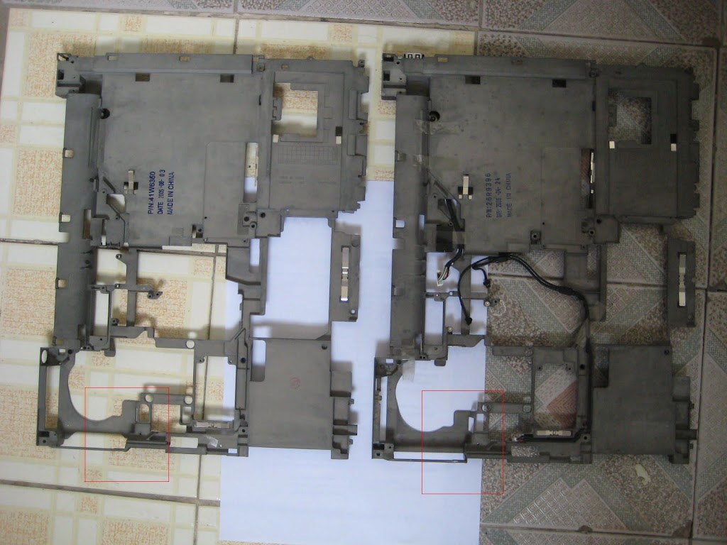 The most interesting is that when I got the frame, it has P/N 41W6360 instead of 26R9396 that is listed in ebay auction and that was broken on my T60p. Mine was manufactured in April 2006, while the new one was manufactured in August 2006. Comparing 41W6360 with 26R9396, I had found that Lenovo modified the new one a bit: the area around VGA port of 41W6360 is ~2 times thicker than that of 26R9396. Therefore, my guess is that Lenovo known about the bug in the middle of 2006 year, and those T60/p with the new structure frame will be less prone to crack.