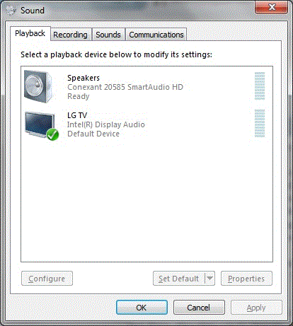This could be very helpful because I can only find Conexant SmartAudio HD option when I go to Sound and Playback devices when the HDMI cable is plugged on to my TV with this adapter. I know there should be another option like on here: http://i146.photobucket.com/albums/r269 ... apture.png but I don't have that. But when I go to Control panel and Device manager, I can find that Intel(R) Display audio from Sound, video and game controllers menu (and Conexant 20672 SmartAudio HD is there also).The audio initially was not automatically passed to the TV as I had to go into one of the audio menus and set the TV as the "default". I'll try to repeat the setup I did a few days ago and come back with precise descriptions for the audio setup, as well as what DisplayPort adapter I'm using (was bought from a local electronics store).