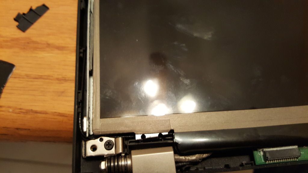 Now you should get something behind the LCD to help keep it pushed forward so the front of the screen meets the LCD bezel. I used some duct tape layered over itself numerous times, stuck on in key places, to keep the screen pushed forward. I also put a couple thin strips against the left hinge arm to keep the screen pushed to the right. (see photo above)