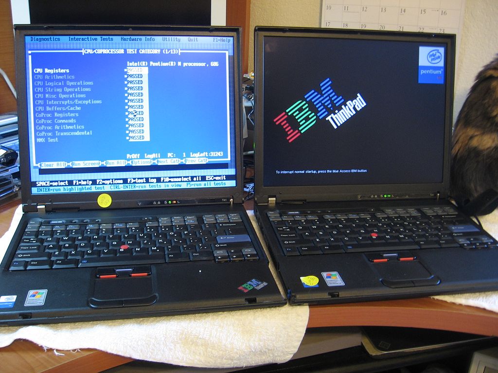 That's Boo. Oh yes, and see that small white spot on the palmrest on the T41 on the left? The first keyboard I mounted in that system had the bad space bar. Wouldn't work on both ends but the middle was okay. Removed the bar and found that the left button is missing the rubber dome and the right one missing the dome and part of the frame. Swapped the keyboard out for the one that's in there now. Went through the PC Doctor keyboard diags and got near the very end and the "/" key felt really funny. Hard to press down. Popped the keycap off and that's what was underneath it. Tiny rock or maybe it's plastic. Can't tell with my eyes. Works fine now. Finally get to use a system that takes "cheap" memory and has USB 2.0! Yay!