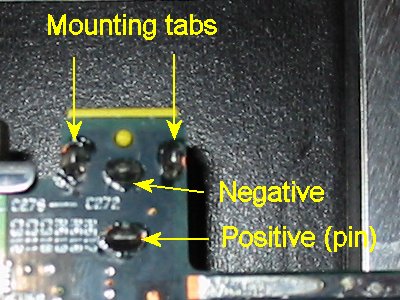 Again, the best way to check to see if everything is wired up properly is to use an ohmmeter. About the only thing that can go wrong with the DC jack is that one of the connections inside is broken and then you won't get any power to the board. Set the meter on the lowest resistance range (typically 200 or 300) and put one end of the ohmmeter on the pin inside the DC jack and connect the other lead of the meter to the "positive" pin I've labeled in the picture. It should read 0 ohms. Do the same with the "negative" pin and the metal tongue inside the DC jack. It should also read 0 ohms. Connect the meter to the positive and negative pins and you should read "infinity". If you measure anything other than that, you have a problem with the motherboard.