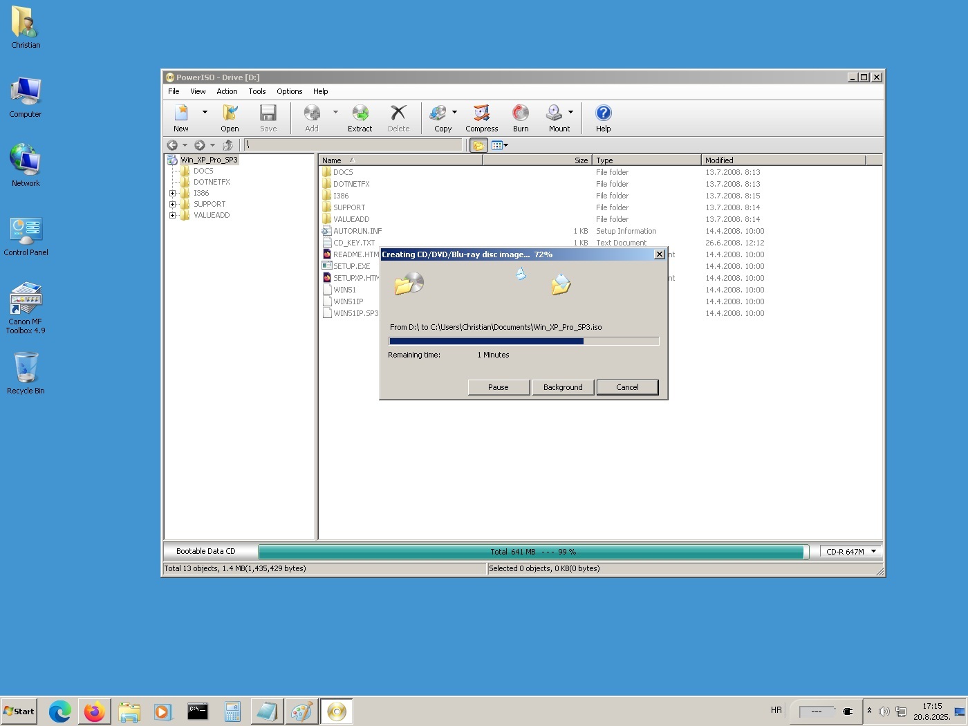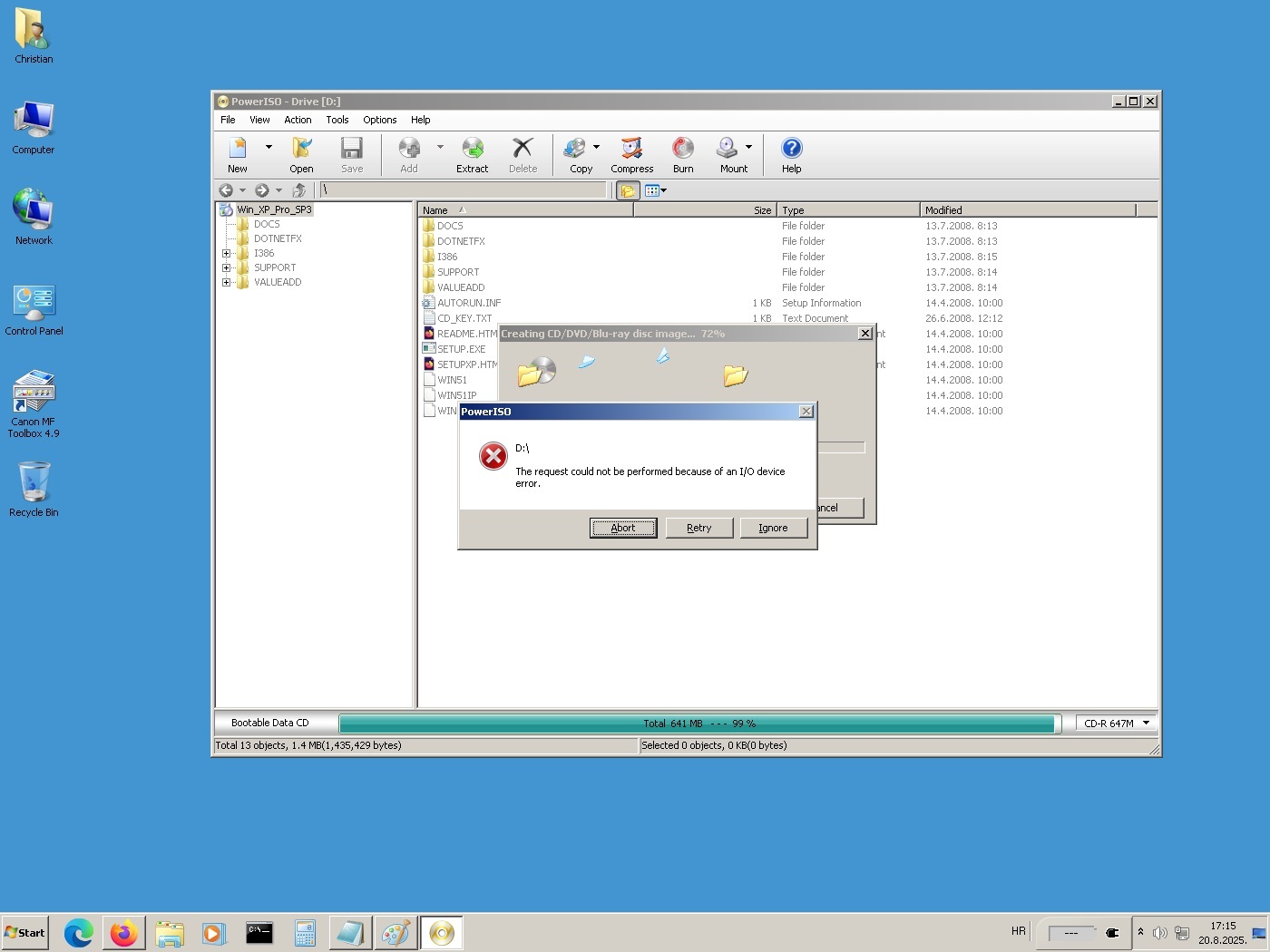 have some problem with Windows XP Pro SP3 that I have on CD, burned many years ago 07/2012. Today I wanted to create an ISO file for backup to have Windows safe with working key, but there is some issue and I thing that the CD has gone. I tried on Lenovo T60p and on Lenovo X61 with Docking Station and the same issue is every time. I used that CD last time in 2013., everything was fine and I get the Windows working, but time is not on my side now I ques.