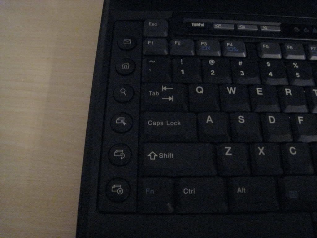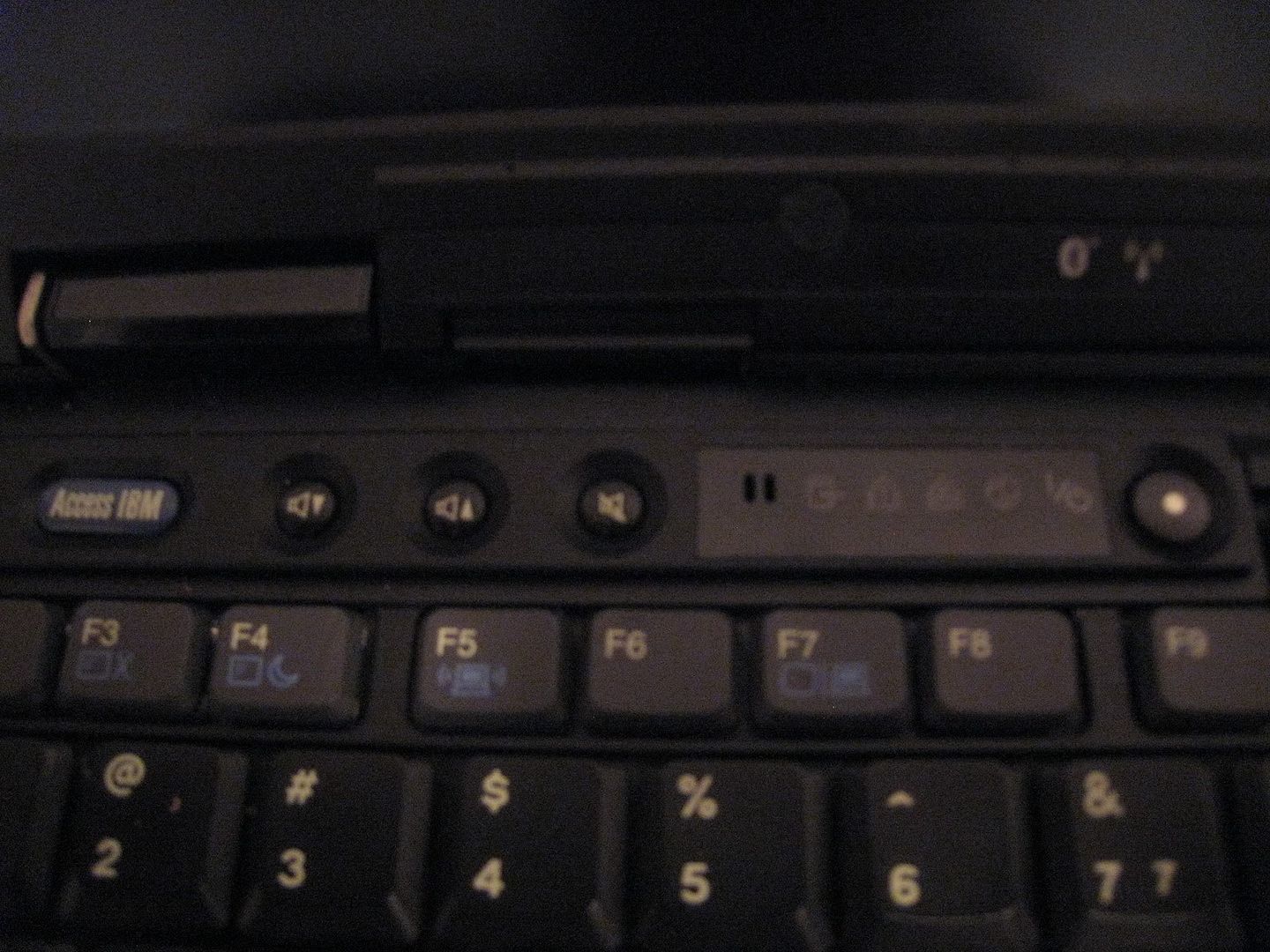 The keyboard closeup reveals a sign of transition - the X32 (and X31) still have most of the LED indicators on the keyboard, and the old round power button, like the older X30, but the newer design for the volume buttons and "Access IBM" (formerly "Thinkpad") button. There is also a wireless status LED on the clearplate, and the Bluetooth hardware switch present on X30 (and A3x, for instance) is gone; both Bluetooth and Wifi are now controlled through Fn+F5 (and you can see the F5 key marked accordingly).