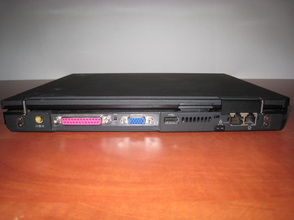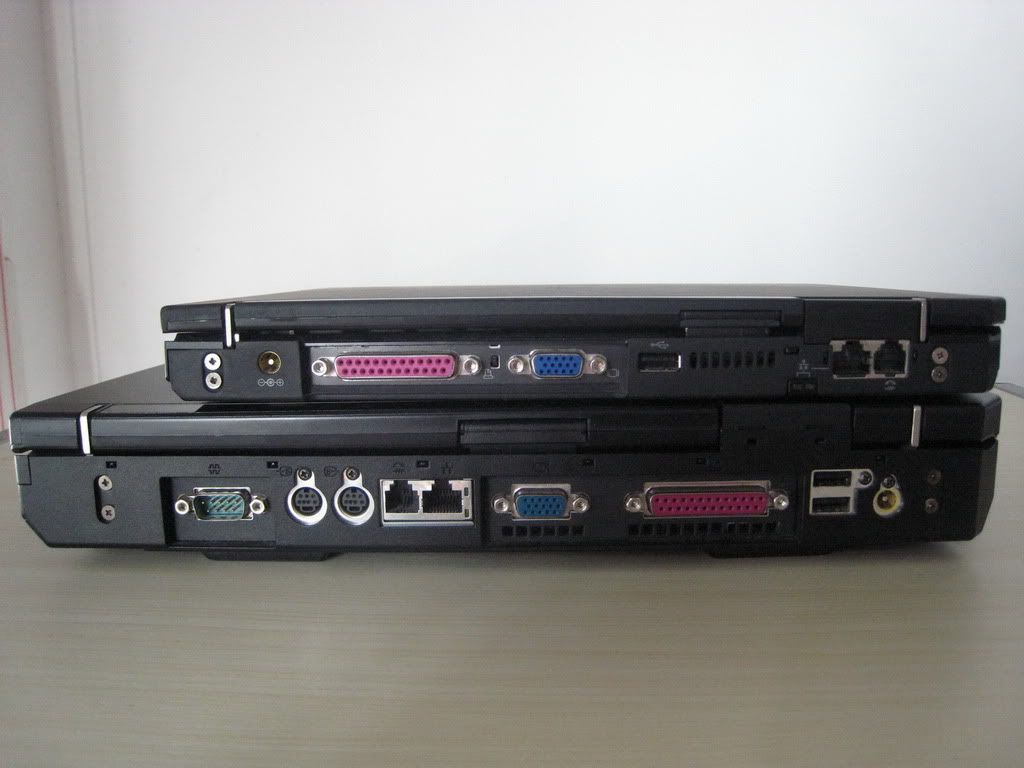 The Ultrabase makes the X32 so much thicker! It also brings the weight close to that of a T-series, but the thickness is probably a bigger deal breaker, as the difference in height between the palmrest and the table makes it somewhat uncomfortable to work. The Ultrabase blocks all the X32 rear ports, and duplicates all of them (power, modem/LAN, VGA, parallel, 1xUSB), and adds PS/2 mouse and serial ports.