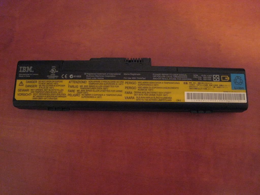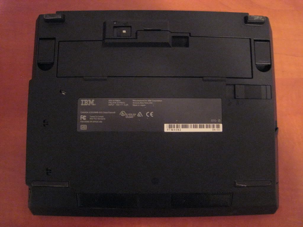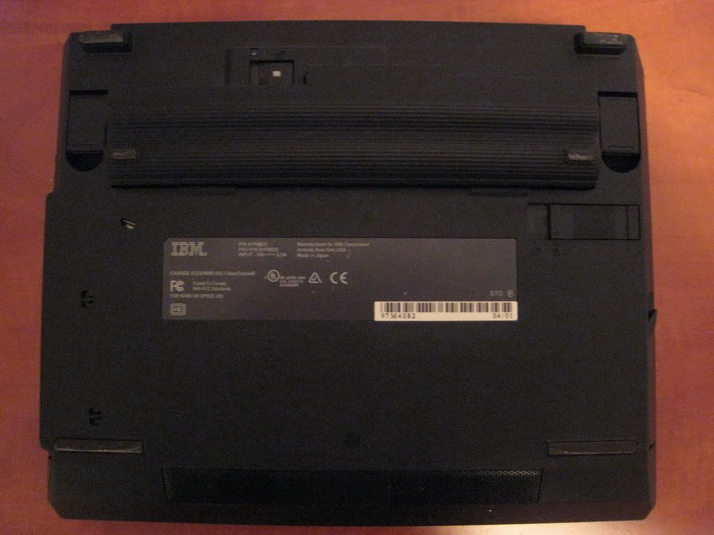 The bottom view reveals a front-mounted battery, which is a 6-cell. The X32 was the last 12" Thinkpad before X220 which a flush-mounted 6-cell battery (the in-betweens had only 4-cells flush), which improves its standard battery life significantly. 4-5 hours are easily possible on a typical X32 (not on this one, though - the IPS screen is somewhat a juice sucker). The fact that the battery is at the front also distributes the laptop weight better when you lift in in one hand, and makes the weight difference versus an X4x/X6x feel somewhat less noticeable.