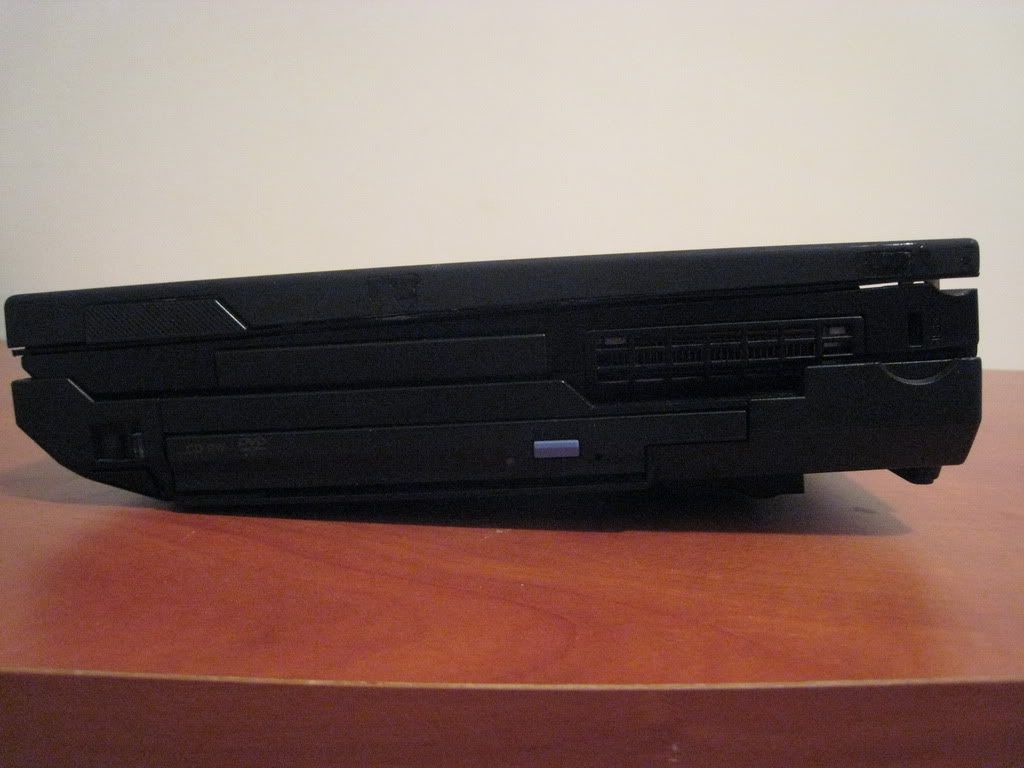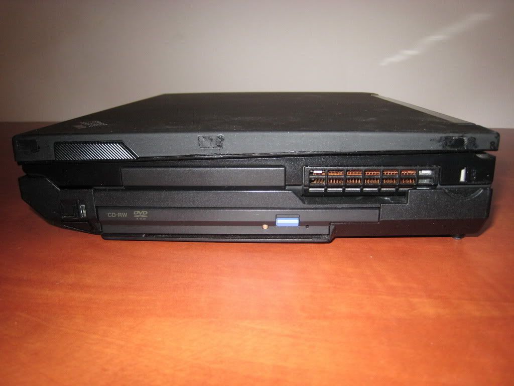 Left: X32 in Ultrabase - left view. All the original ports of the X32 remain accessible - 1xUSB, Audio (last Thinkpad with a separate line-in), CF slot (under the audio jacks), PCMCIA/Cardbus and Firewire. Note that the Ultrabase does not provide its own audio ports - it relies on those on the chassis. This means you cannot use the Ultrabase as a permanent docking station with external speakers - you'll have to plug the speakers into the laptop manually each time - a disadvantage. The Ultrabase does have its own set of stereo speakers, somewhat better than the mono speaker on the laptop itself, and it is possible to use the other docking solution, so I guess it's not a fatal flaw. Still, a flaw, and one which was eventually rectified by Lenovo with the