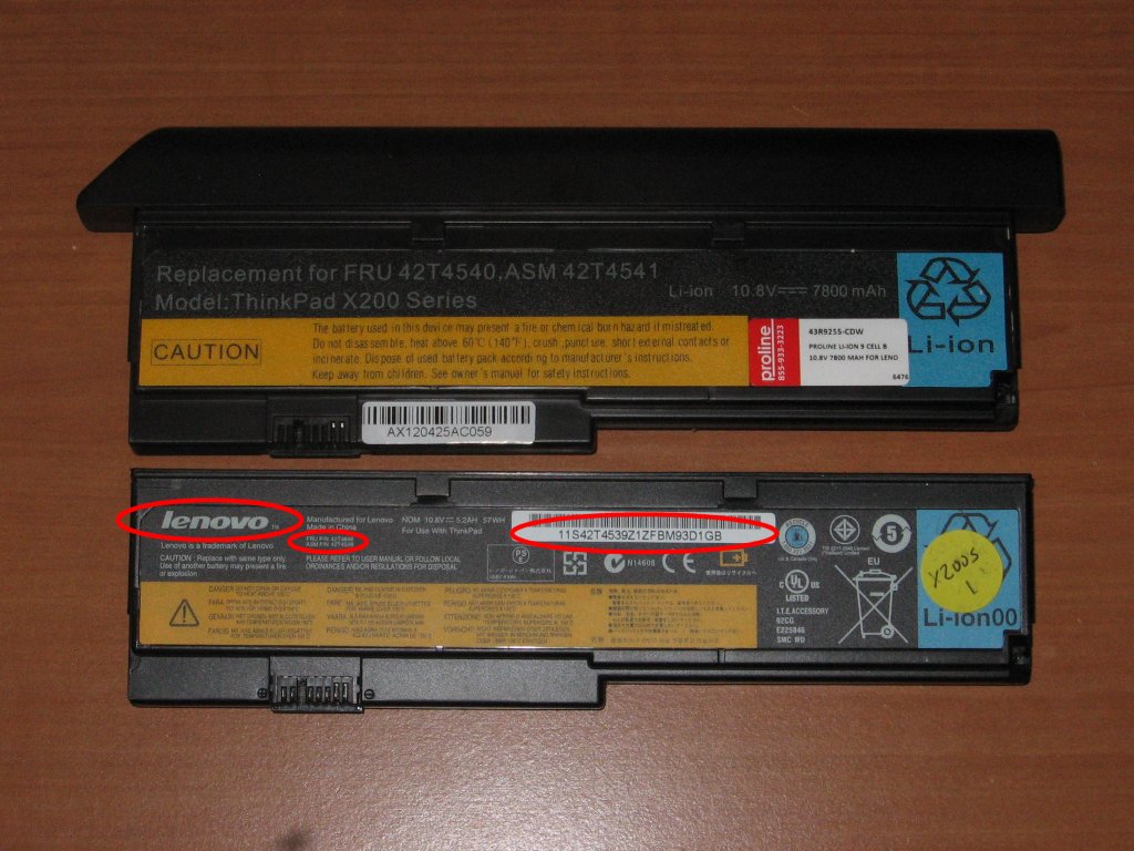 Top battery is a 9-cell "replacement" from Proline; the bottom one is a factory 6-cell (FRU 42T4648/ASM 42T4539). Note the missing "lenovo" logo on the Proline model. Also there's no bar code label with the proper format. "Knockoff" batteries typically try to copy the label colors of the factory model as close as possible so with a quick glance, they look the same. They usually do not have the multiple languages and certification marks like the original and most of the ones I've seen have "Replacement for ....." written on them.