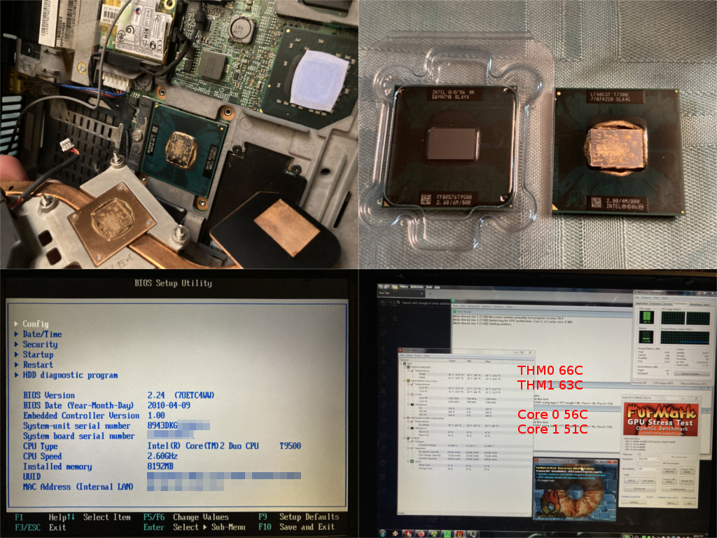 The previous owner had used greasy gold paste for their T7300 upgrade, the combination of that and Merom explains why I thought the machine was running "hot", I saw 80C or so (and pragmatically that's not even hot). Now with the Penryn and Arctic MX-6 a few minutes of P95 and Furmark didn't exceed 66C on the ThinkPad's sensor nor 60C on the CPU's own sensor, and it idles around 40C-30C respectively. :o This is now my coolest running laptop.