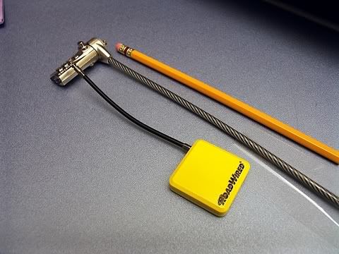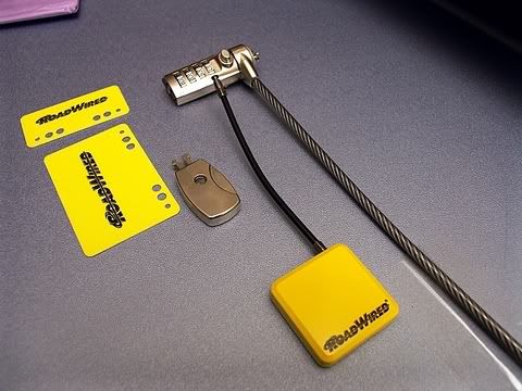 RoadWired® has a very interesting and unique product called the KeyCard TraveLock™ Security Kit. RoadWired® designed this lock with the concept of providing an alternative solution to securing luggage and laptop computers without the hassles of dealing with small keys or having to remember combinations. The TraveLock™ Security Kit consists of one KeyCard lock, two keycards (one large, one small), one laptop lock adapter, one 60” cable and one 4.5” cable; both cables are braided galvanized steel with a PVC coating and brass headers. RoadWired® states the cables can withstand 330lbs, the KeyCard lock holes can withstand 110lbs, while the laptop lock adapter can withstand 70lbs. If the lock functions as advertised that should be more then enough strength to properly secure your laptop.