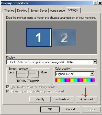 Next, go to "Display Properties" and set the resolution to 800x600 and the color quality to 16 bit, then click the "Advanced" button.