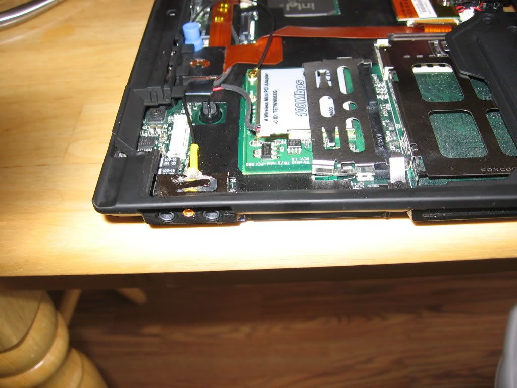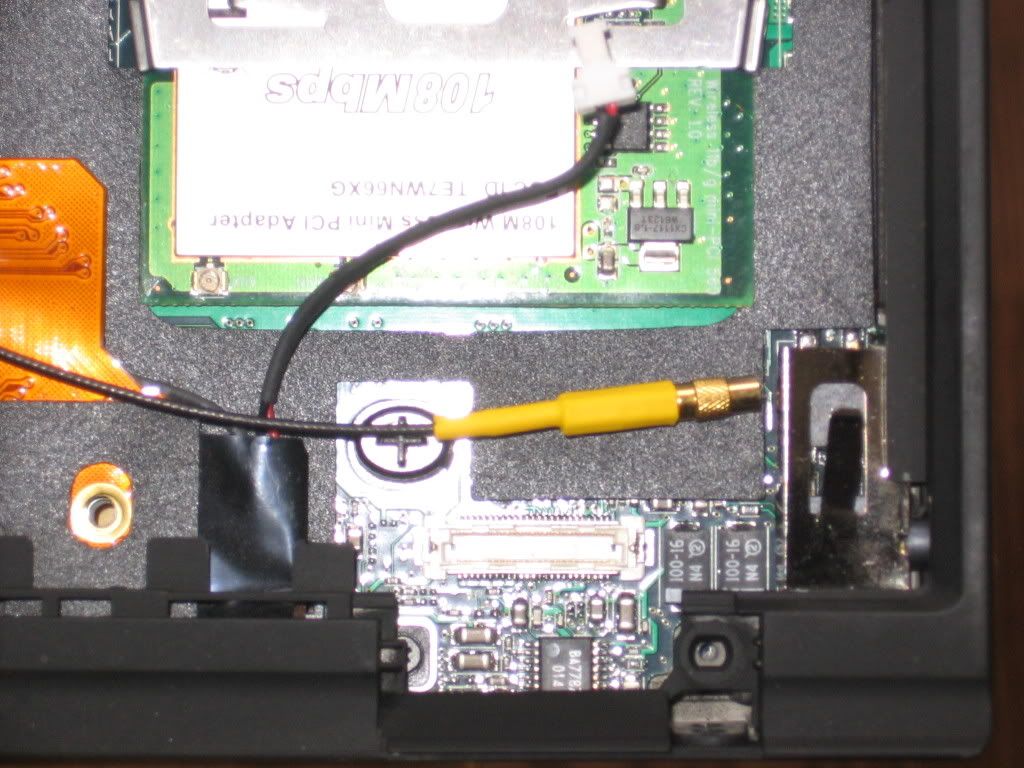 I used a U.FL to male RP-SMA adapter about 6" long, drilled a hole in the back of the modem port, as my X22's wireless pci card doesn't have a modem in it, ran the pigtail through, and secured it in the modem port with lots of super glue, and is extremely strong.