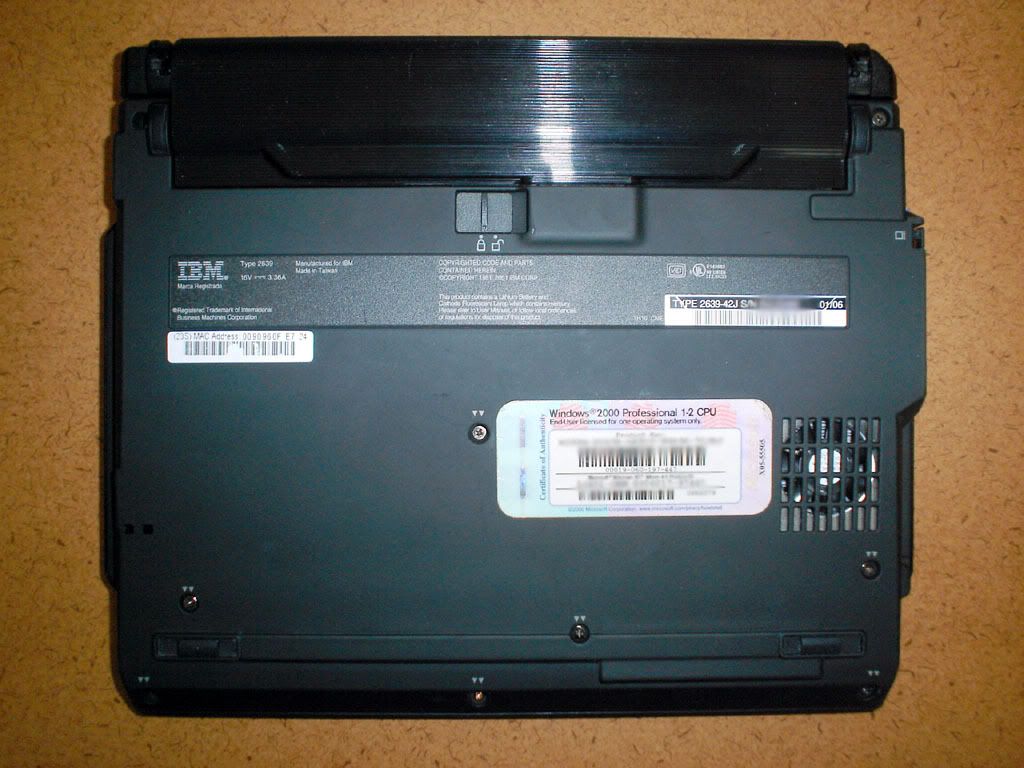 An AC adapter is included. The keyboard is a Japanese-English keyboard with little shine. The screen looks very good. The Windows 2000 COA sticker is intact (I've blurred the product key in the photo below), and Windows 2000 is installed. The battery holds a good charge although the Battery Maximiser doesn't say exactly how much charge remains (due to the relatively old chipset). According to Win 2000, it took 4 min for the batt to discharge from 100% to 98%, so I'd say the battery lasts for anywhere between 2 and 4 hours.