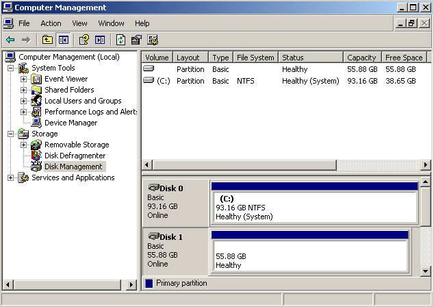 - Click: Start / Settings / Control Panel / Administrative Tools / Computer Management / Disk Management (whew!)