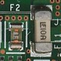 - the fuses on the motherboard are identified by "F" numbers; F1, F3, F11, etc. Typical surface mount fuses for the main power look like this: http://www.kawakami-ca.com/images/t22_main_fuses.jpg The one on the left (clear plastic looking with "FU" marked on top and denoted by the "F2" printed on the motherboard) protects the DC input on T2x motherboards. The one on the right (white ceramic with metal endcaps, with "F11" printed next to it) is the type which protects the battery and Ultrabay.